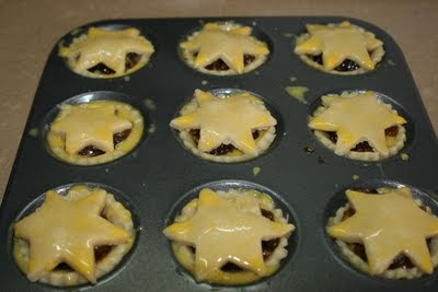 Cortar la misma cantidad de estrellas y colocar sobre el mincemeat. Pintar las estrellas con el huevo batido.