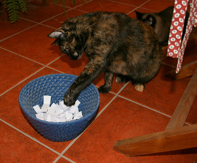 Pues superado este trámite, os cuento que tan pronto he llegado a casa me he puesto en la terraza con Antonio a preparar y cortar los papelitos de sorteo, y nos hemos dado cuenta de la expectación que estábamos creando en Chucky, que estaba como loca con tantos cachitos de papel por encima de la mesa. Así que, qué mejor mano inocente, digo, patita inocente e insobornable que la de Chucky para sacar el papelito del ganador!!!!