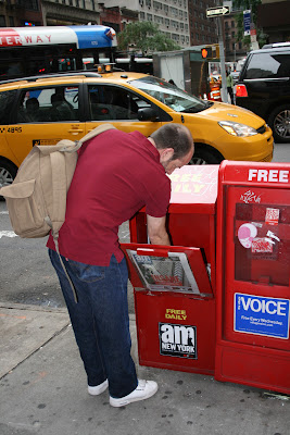 A las 7 de la mañana estamos ya en planta y dispuestos a recorrer y conocer nuestra zona de influencia, el Lower Midtown. Para sentirnos totalmente americanos nos cogemos un par de cafés en el hotel par ir bebiéndolos por la calle….. el fresco de la mañana hace que el café caliente nos reconforte. Como si lo hubiese hecho toda la vida, Antonio abre uno de los expendedores de periódicos gratuitos, una cosa que siempre quiso hacer…………….. Y yo de reportera conseguí el documento gráfico del momento!!!!